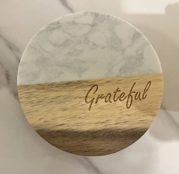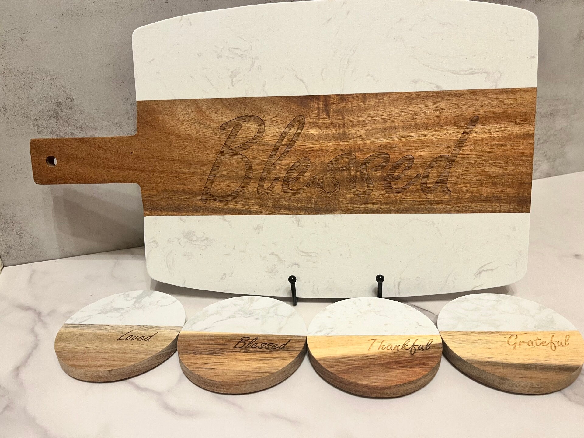 Absolutely stunning wood and marble cutting/serving board, along with set of 4 coasters. Board 17"x10", coasters ~4" Design can be customized or as is.