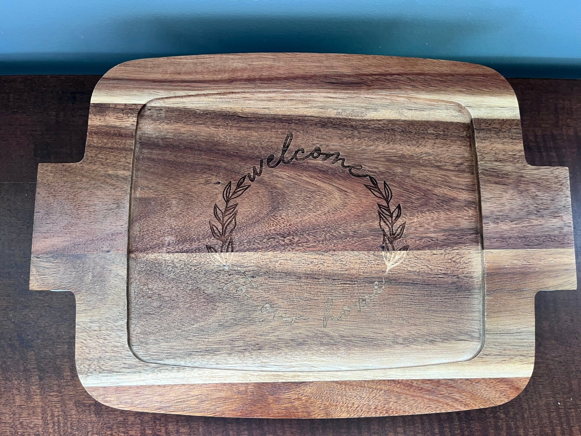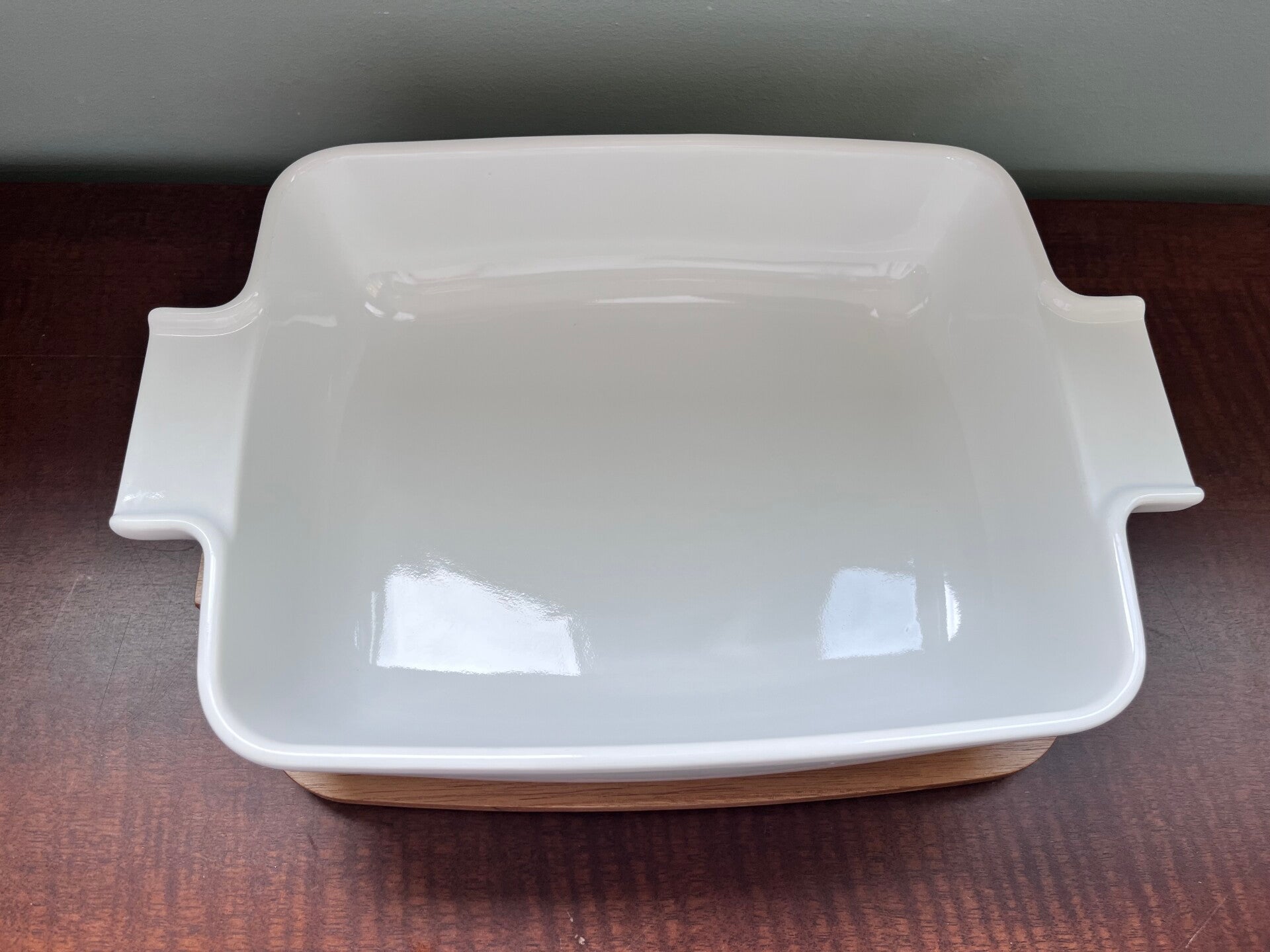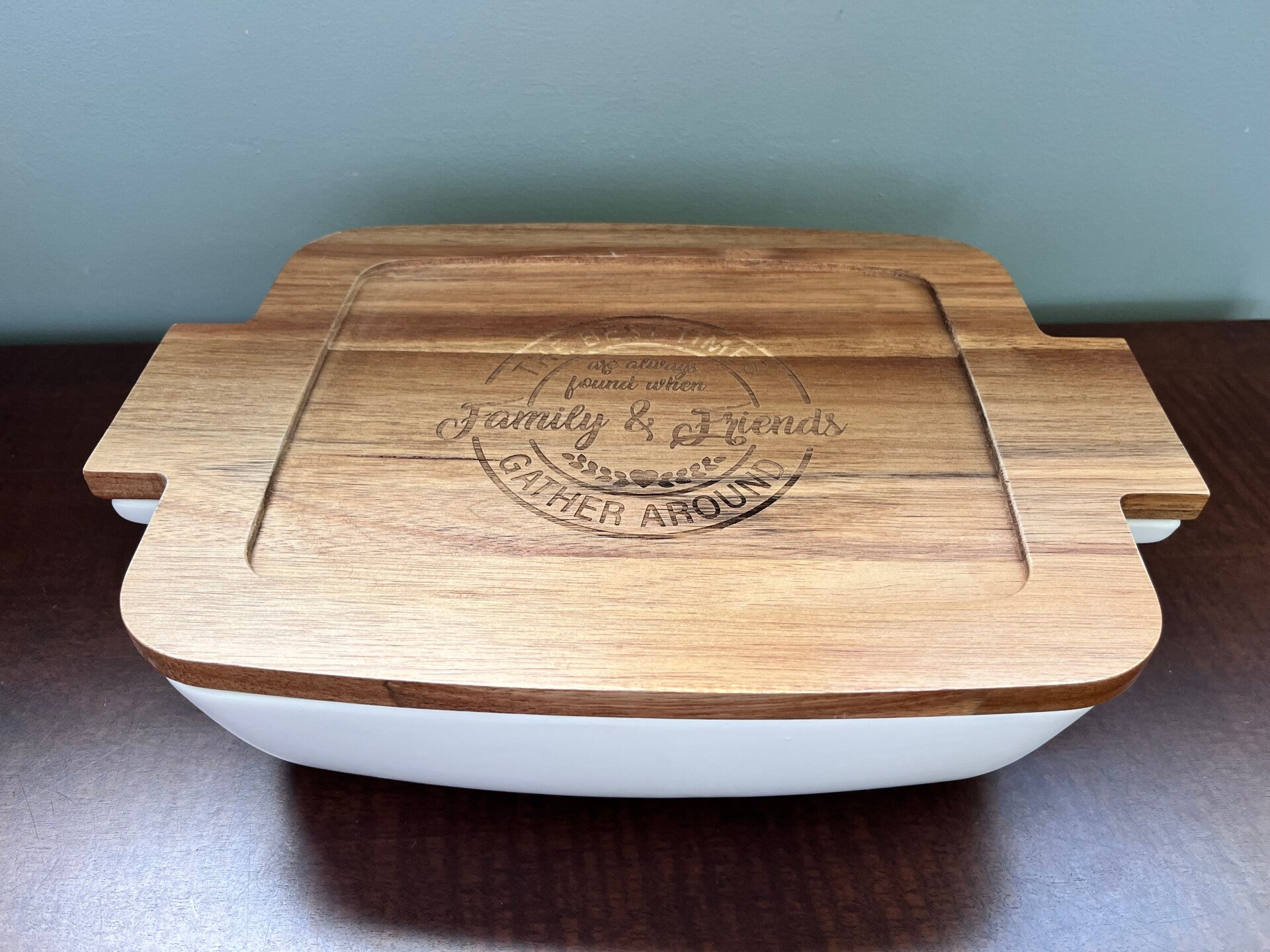 Ceramic dish with engraveable acacia lid! Customize the design to beautify your table. 13.39x9.06x3.39" Lid doubles as a trivet. Lid is handwash only to preserve its beautiful design and not dishwasher or microwave safe.